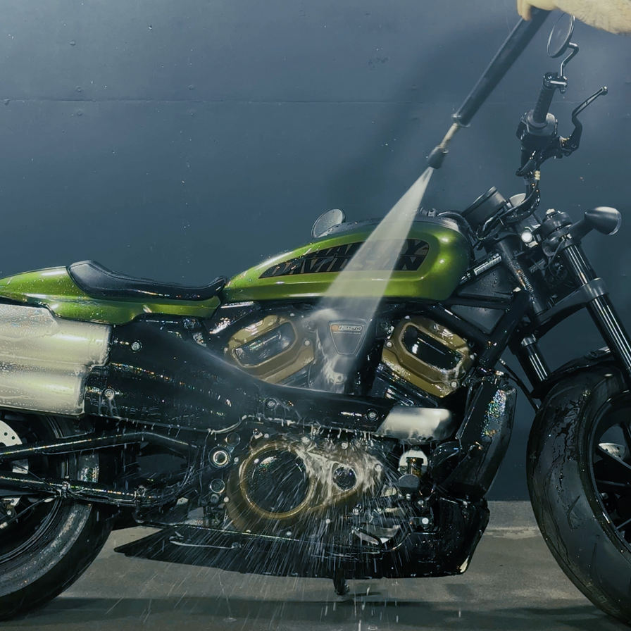 - Spray SWISSVAX Supreme Motorcycle Cleaner onto the cold, dry surface, spread the cleaner with a brush and leave it to work for 1-2 minutes, then gently rinse the vehicle again with the high-pressure cleaner.